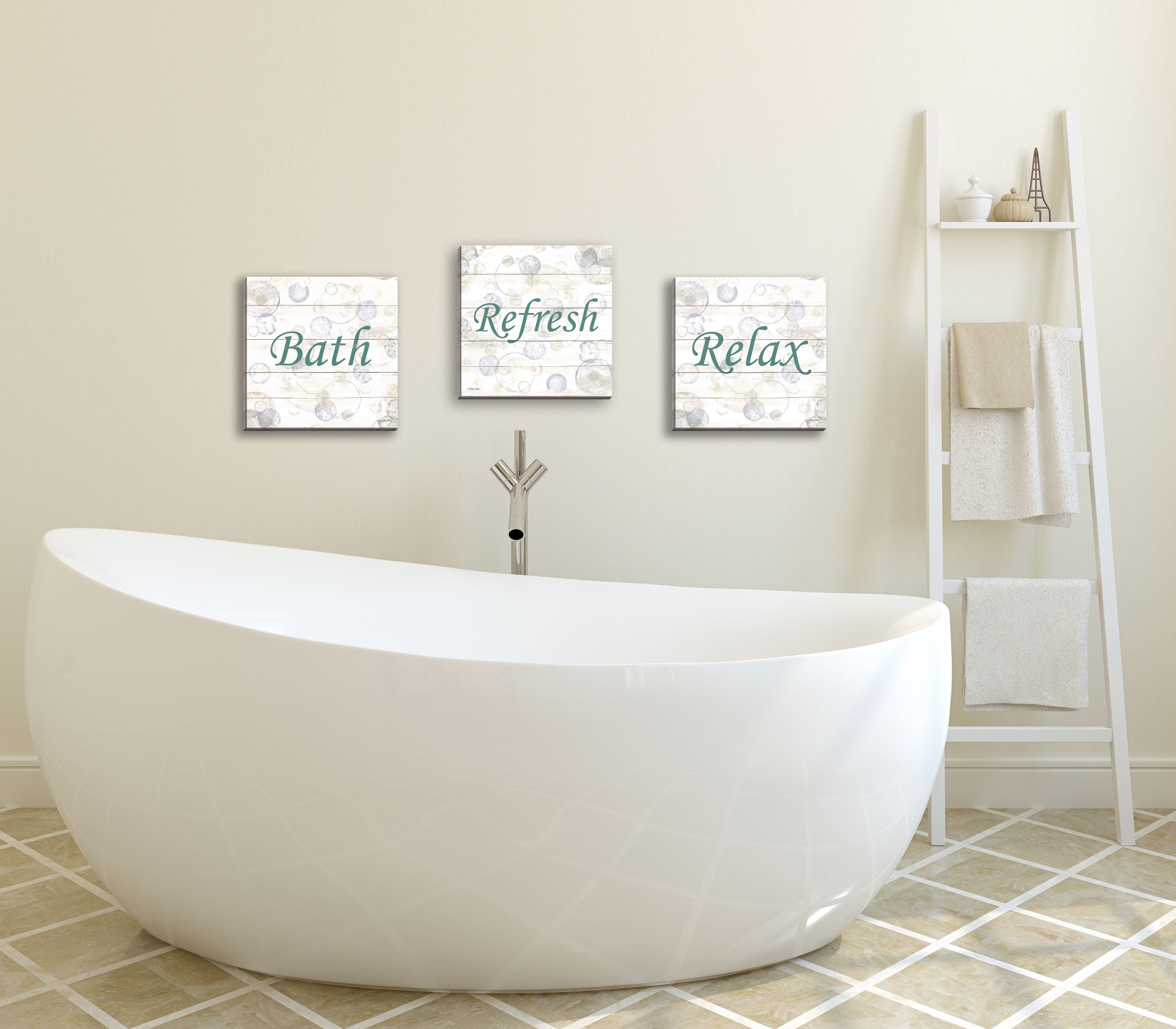 Gango Home Decor Casual Bathroom Wall Art Three Off White 12x12in