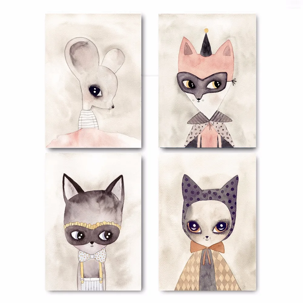 2020 Watercolor Fashion Fox Mouse Cat Poster Prints Wall Art